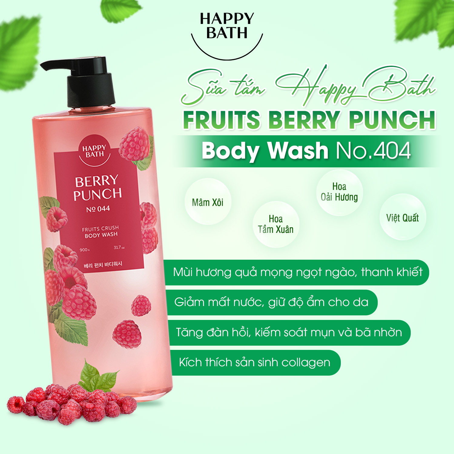 Happy Bath Fruits Berry Punch Body Wash 900g is extracted from natural fruit ingredients with fine foam to help deeply clean the skin, fight oxidation and rejuvenate the skin, along with a sweet scent that will help relax your skin, fatigue and stress disappear.
