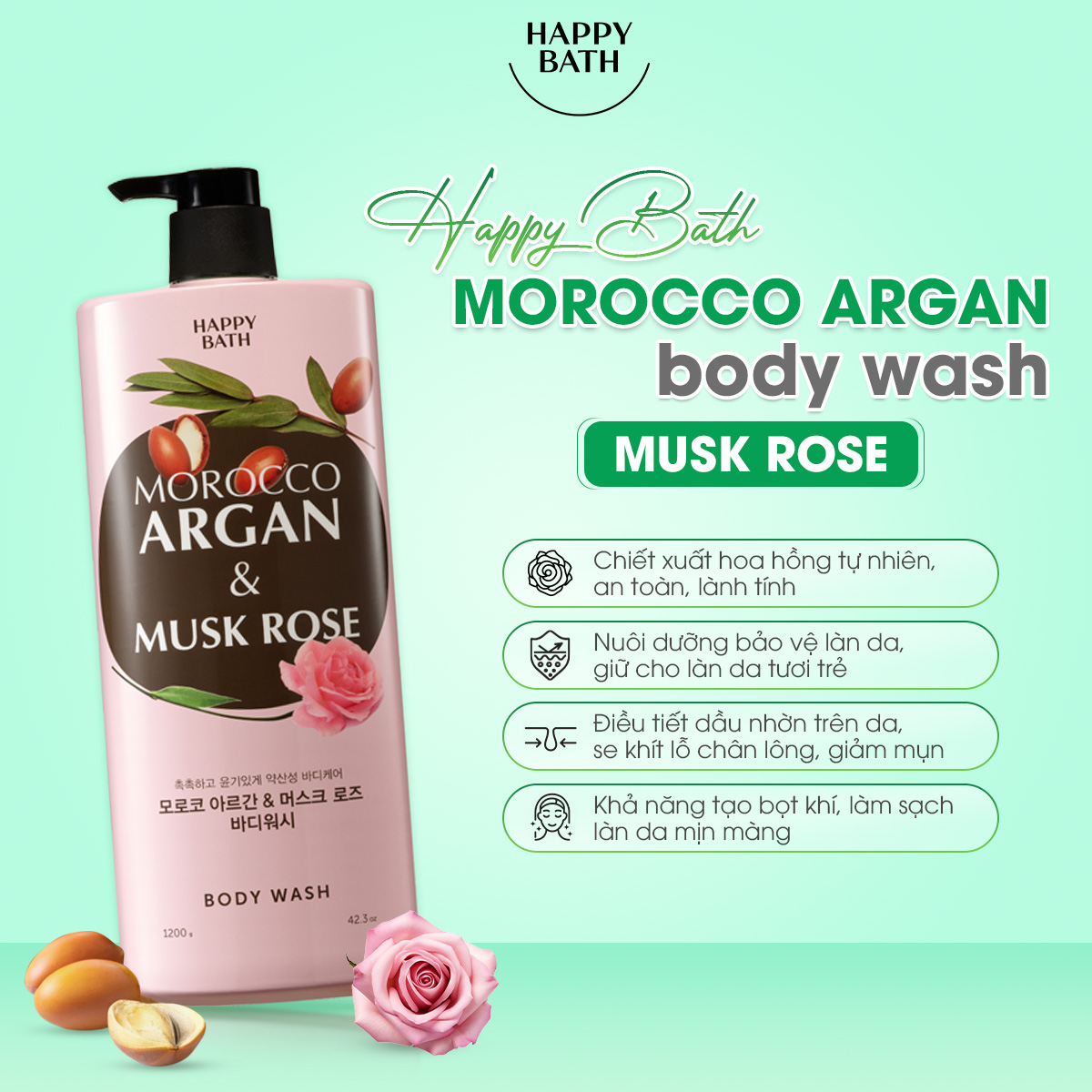 Happy Bath Morocco Argan & Musk Rose Shower Gel 1200g shower gel contains Argan oil from Morocco and the fragrant scent of roses, bringing a passionate, intoxicating and seductive scent that makes your spirit completely refreshed and relaxed after bathing.