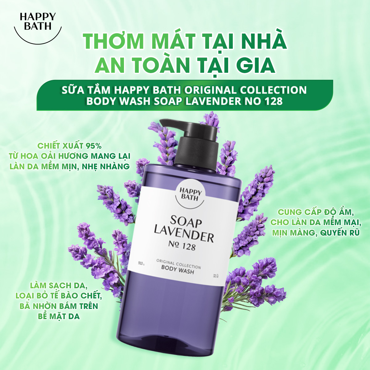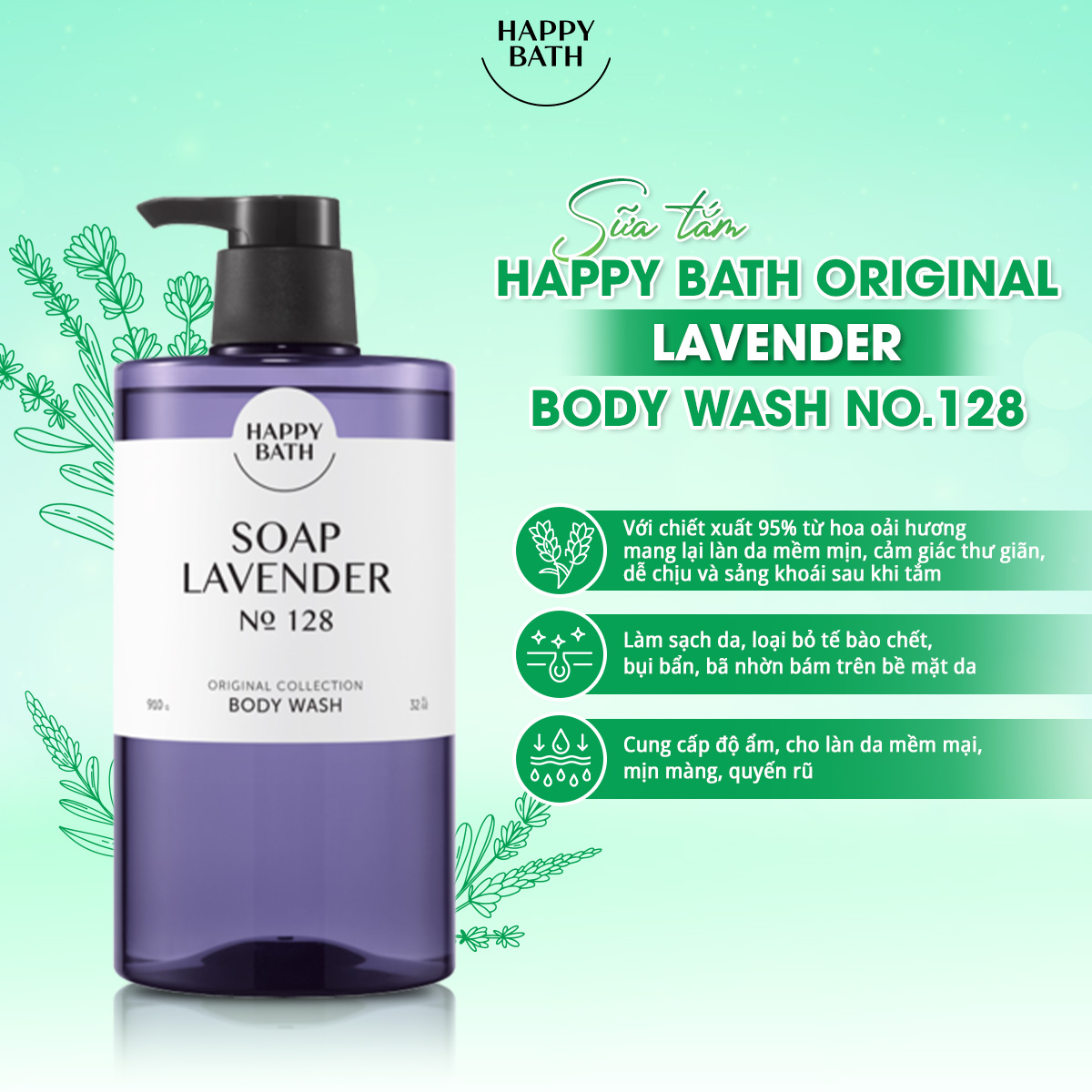 Happy Bath Original Lavender Body Wash No.128 with its superior formula of smoothing and moisturizing helps your skin effectively absorb multi-nutrients from nature, making your skin smooth, soft, shiny and full of vitality, while retaining a charming, passionate scent. In addition, Lavender essence extract helps to relax the mind.