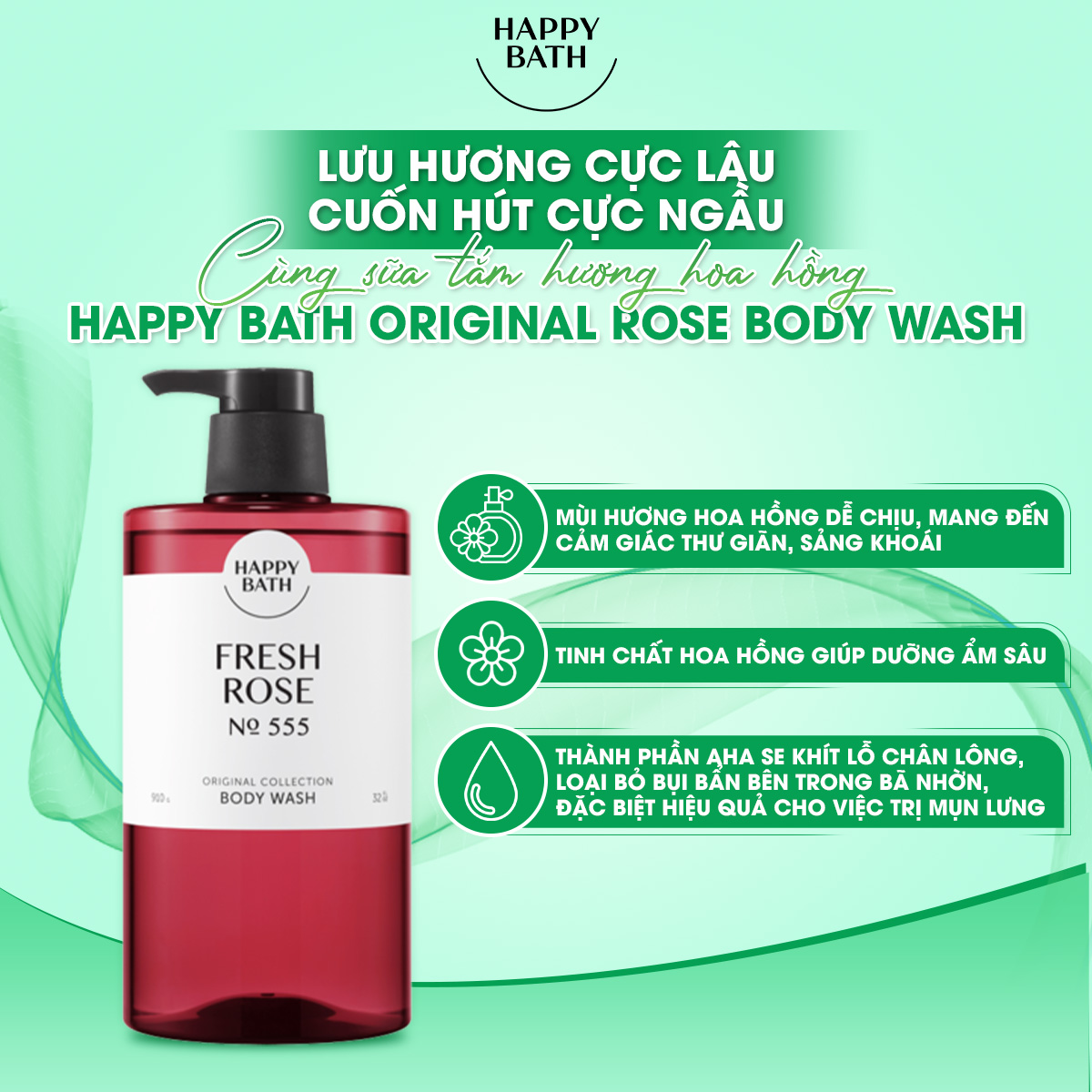 - Happy Bath Original Rose Body Wash is a shower gel with lots of super small and extremely smooth bubbles, so it will enhance the skin cleansing effect. In addition, rose essence will penetrate quickly and bring water-absorbing nutrients deep into the skin to deeply moisturize, making the skin feel truly comfortable, refreshed and relaxed.
