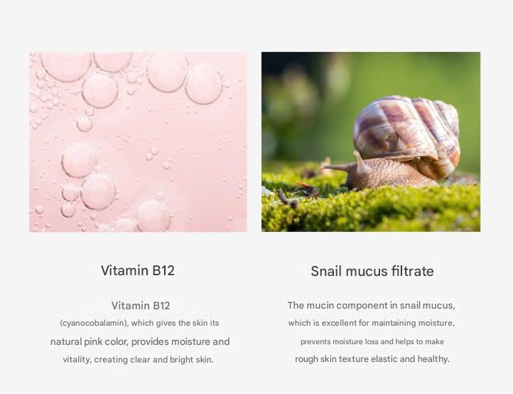 Water, Glycerin, Methylpropanediol, Niacinamide, Butylene Glycol, Phenoxyethanol, PEG-32, Xanthan Gum, Erythritol, Trehalose, Allantoin, Polysorbate 20, Snail Secretion Filtrate, Hydroxyethylcellulose, Dimethicone, Ethylhexylglycerin, 1,2-Hexanediol, Disodium EDTA, Sodium Polyacrylate , Hydrogenated Lecithin, Dipotassium Glycyrrhizate, Fragrance, Disodium Phosphate, Polysorbate 60, Sodium Hyaluronate, Sodium Phosphate, CI 15985, CI 16185, Artemisia Princeps Leaf Extract, Calendula Officinalis Extract, Folic Acid, Pyridoxine, Riboflavin, Thiamine HCl, Menadione, Biotin, Cyanocobalamin, Glucose, Hyaluronic Acid, Hydrolyzed Hyaluronic Acid, Panthenol, Ascorbic Acid, Bioflavonoids, Glutathione, Tocopheryl Acetate